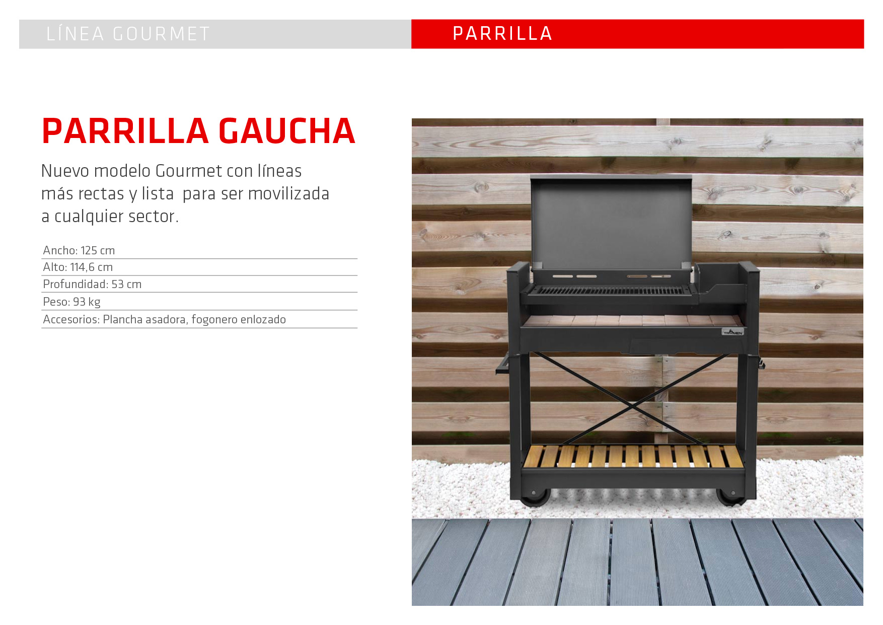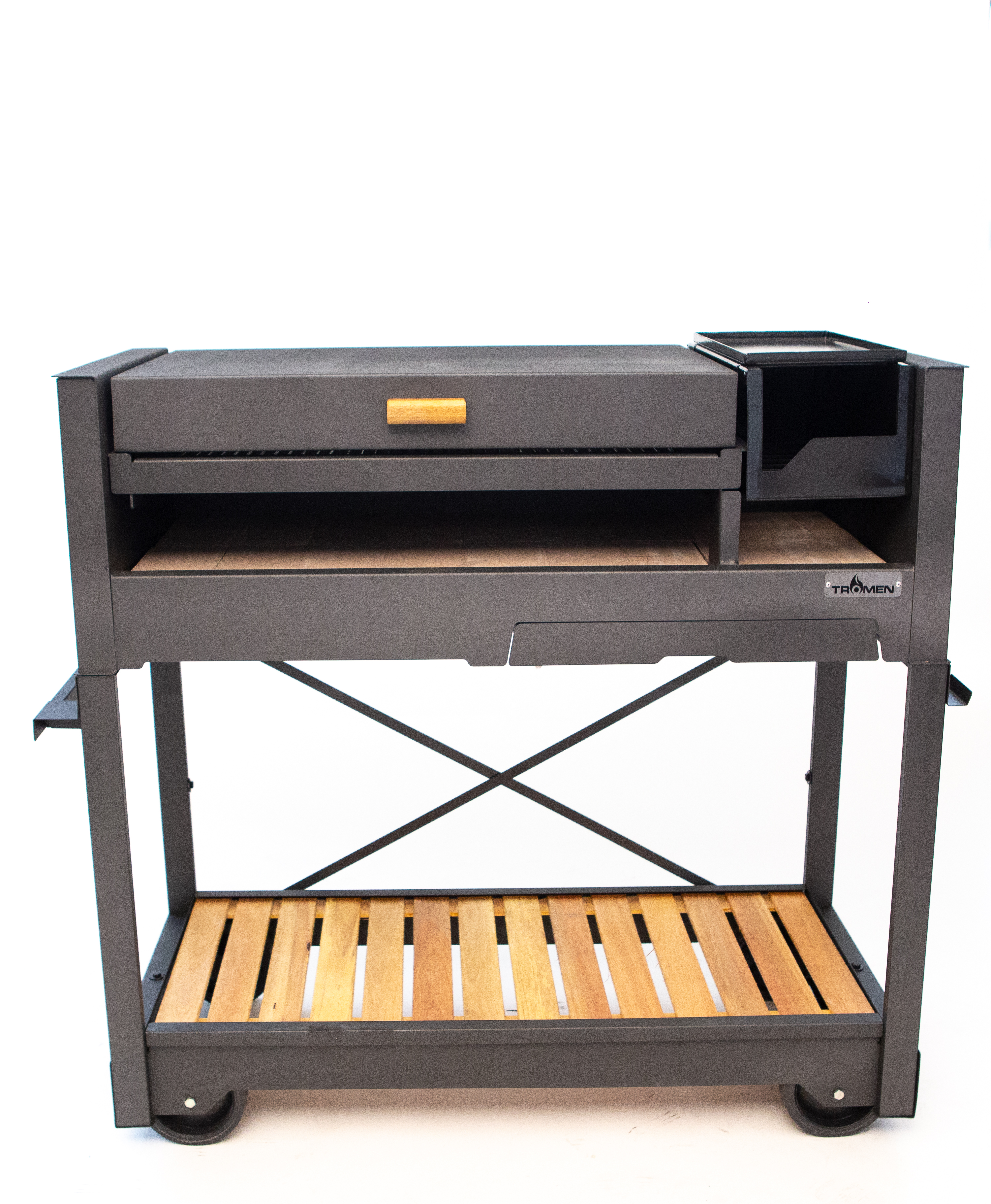 Fogonero con base desmontable y soporte. Nueva base con punto fijo de apoyo, más segura. Módulo de parrilla enlozada desmontable. Plancha asadora enlozada y tapa. Base y perímetro con ladrillo refractario.